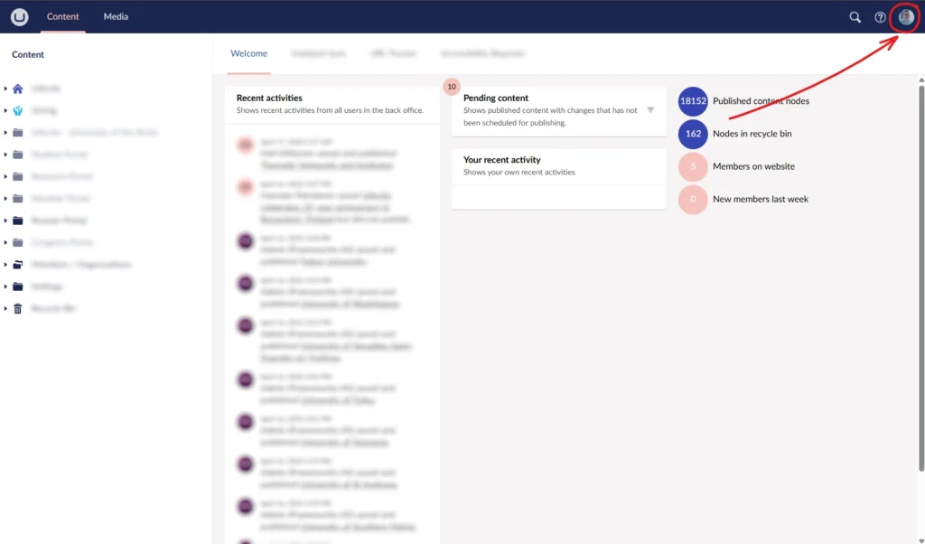 Først logger du på Umbraco på vanlig måte via en egen adresse for innlogging. Dersom du er usikker på hva adressen er kan du ta kontakt med oss i Frameworks, men den er ofte nettsidendin.no/umbraco (erstatt nettsidendin.no med den faktiske adressen til nettsiden din)